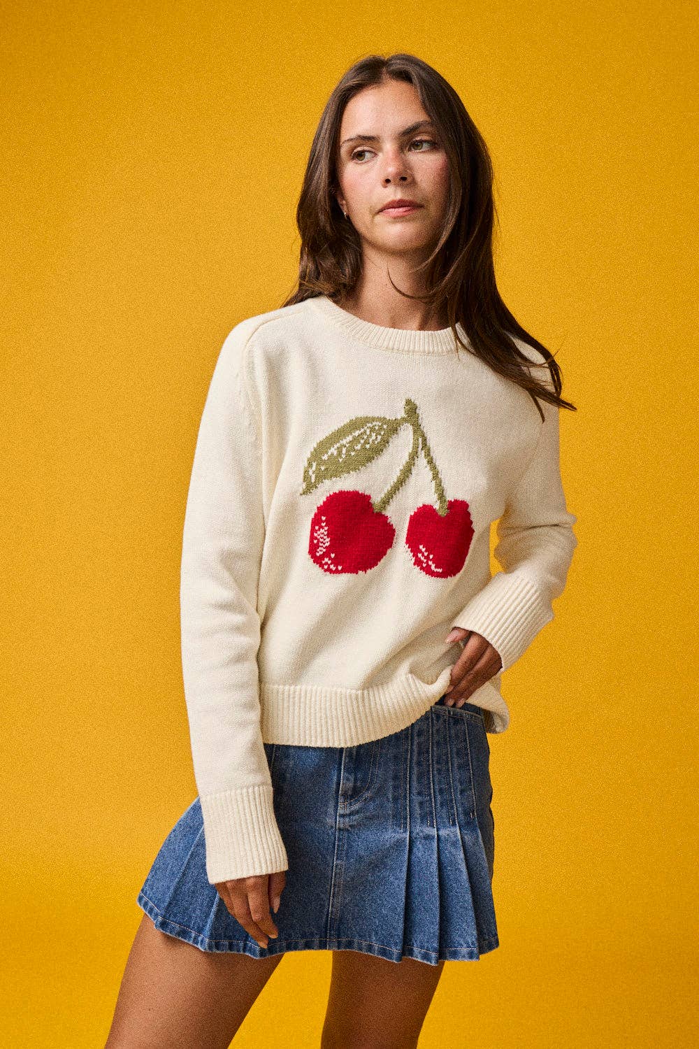 Introducing the Cherry Graphic Knit Sweater – your new go-to piece for effortless style with personality. This cozy pullover features a bold cherry graphic that brings a playful pop of color to any outfit, perfect for channeling that retro-cute aesthetic we're all craving. The ribbed cuffs and hem provide a polished, structured fit that keeps everything in place, while the soft knit fabric wraps you in comfort all day long. Whether you're layering over a tee or wearing it solo, this cheerful essential strikes the perfect balance between fun and wearable. It's the kind of sweater that makes you smile every time you put it on – because life's too short for boring knitwear.