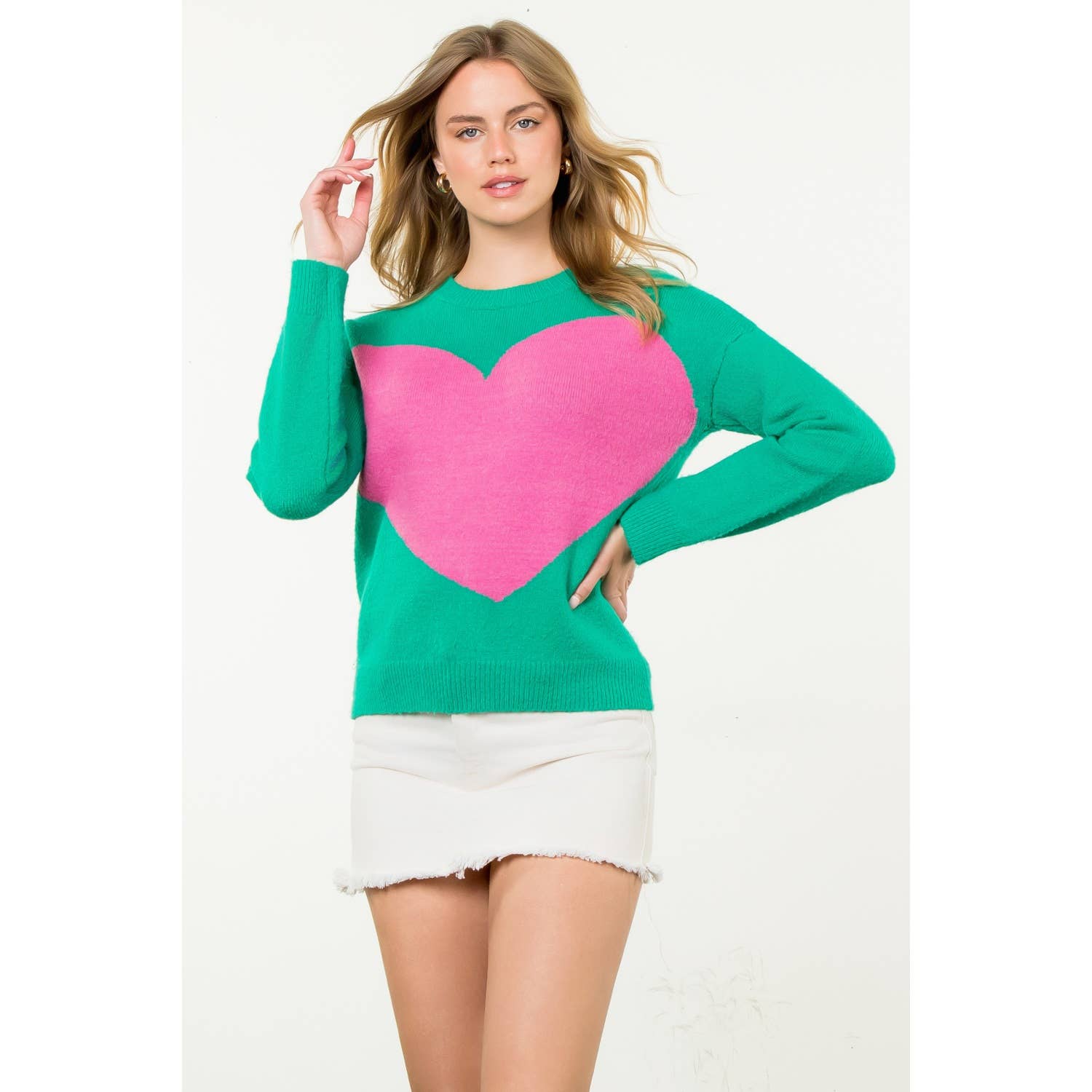Colorblock Heart Knit Sweater in a stunning kelly green with a bold bright pink heart that steals the show. This playful knit is perfect for adding a pop of personality to your everyday wardrobe. The soft acrylic blend keeps you cozy and comfortable, while the touch of spandex ensures a flattering fit that moves with you. Whether you're dressing up for a night out or keeping it casual, this sweater brings instant charm and a cheerful vibe to any outfit. The vibrant color combo makes it an easy go-to piece that works year-round.