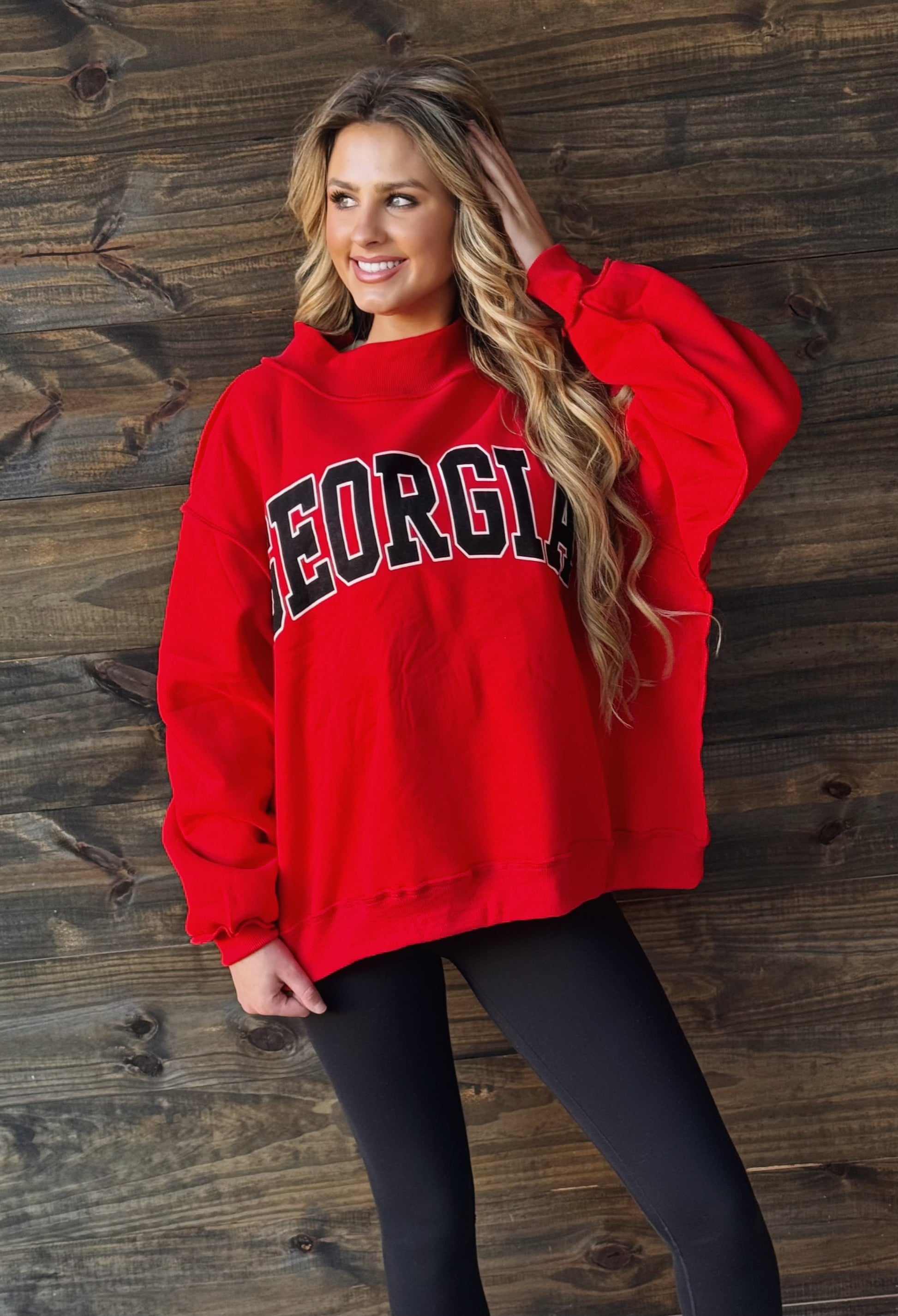 This playful 'GEORGIA & GA' reversible mockneck sweatshirt features a cozy mock-neck and drop shoulders with long sleeves. Made from the softest fleece, it offers an oversized fit for ultimate comfort. Ribbed hemline and cuffs add a snug finish, while the reversible design lets you flip your look whenever you want.