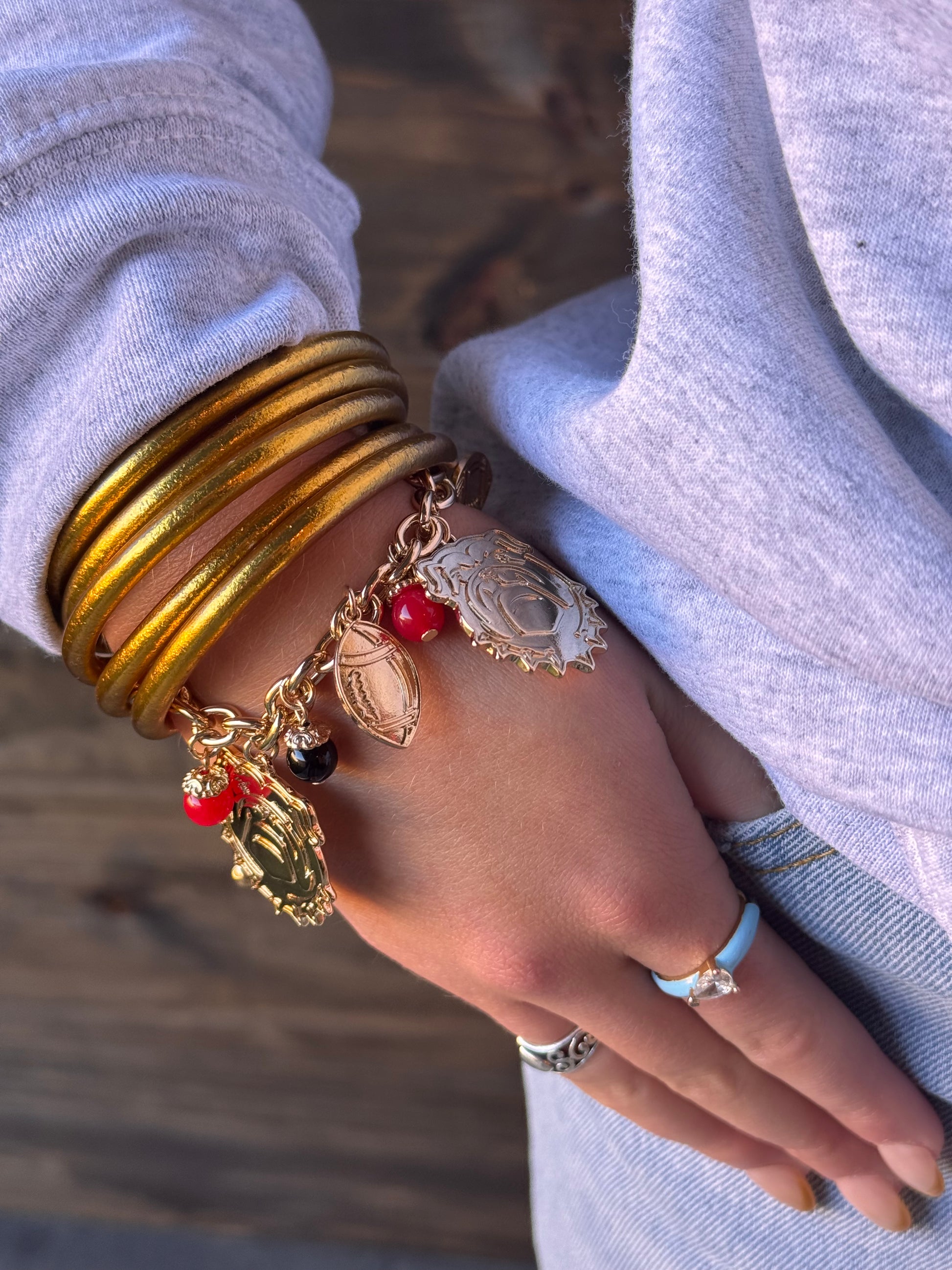 Show your team spirit with this playful Bulldog charm bracelet. Made of acrylic and metal, it features a secure lobster clasp and measures 8 1/2” long—perfect for game day fun!