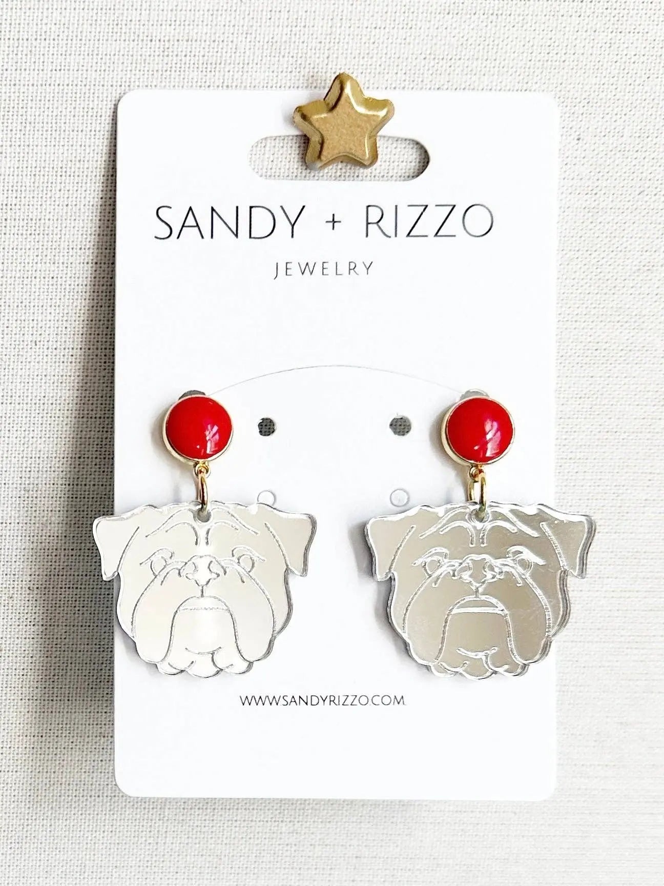 Medium silver mirrored, etched bulldog dangle with red enamel top. Perfect for cheering on your team like Louisiana Tech, or Georgia Bulldogs!