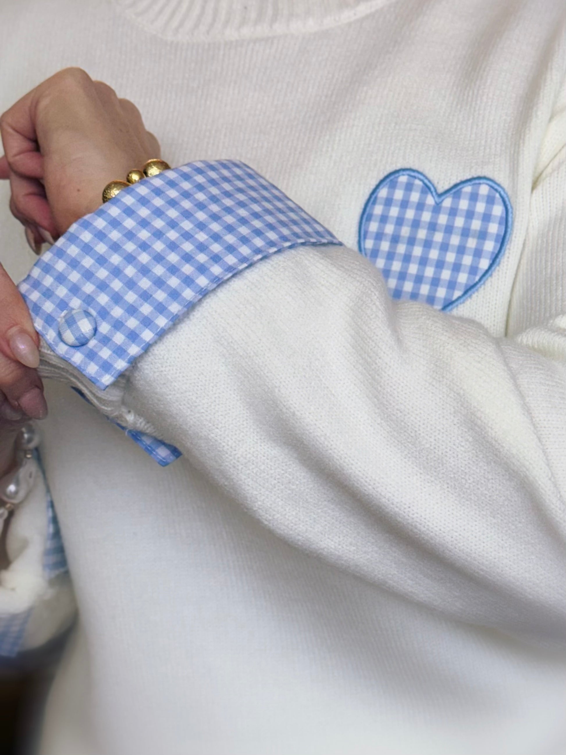 Cozy up in this charming plaid heart patch sweater that brings together classic comfort and quirky style. The soft solid knit base pairs perfectly with playful plaid gingham cuffs and an embroidered heart detail that adds personality to every wear. Designed with relaxed drop shoulders for an effortlessly cool silhouette and finished with a timeless crew neck, this sweater is your new go-to for casual days and cozy nights. Whether you're layering over your favorite tee or wearing it solo, this piece proves that the sweetest style comes from the little details.